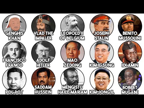 0:00 - Genghis Khan 1:57 - Vlad the Impaler 3:47 - Leopold II 5:36 - Joseph Stalin 7:23 - Mussolini 9:22 - Franco 11:20 - Adolf 13:06 - Mao 15:00 - Kim Il Sung 16:44 - Idi Amin 18:31 - Pol Pot 20:18 - Saddam 22:00 - Mengistu 23:43 - Kim Jong Il 25:21 - Mugabe